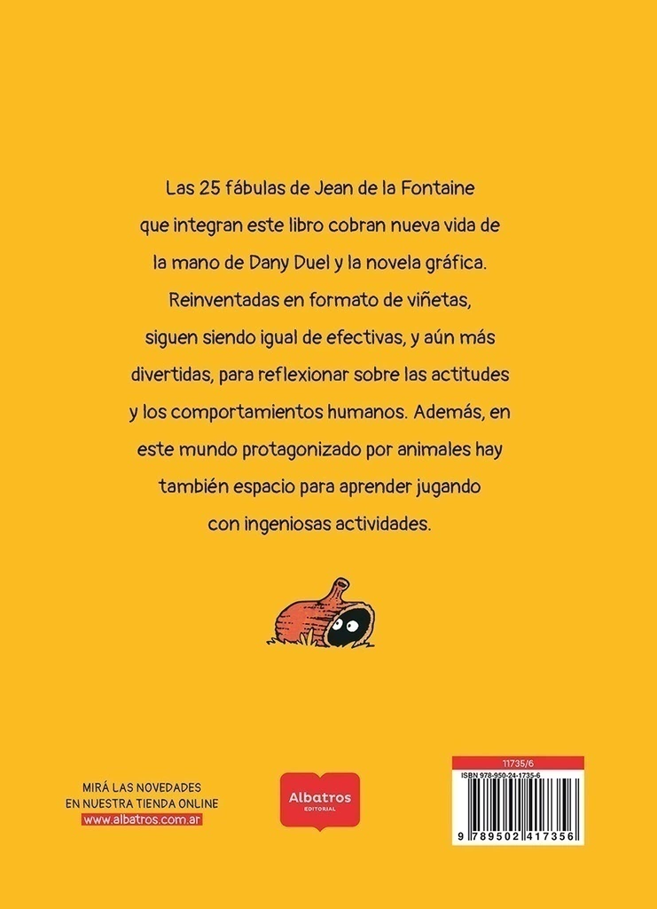 Las 25 fábulas de Jean de la Fontaine que integran este libro cobran nueva vida de la mano de Dany Duel y la novela gráfica. Reinventadas en formato de viñetas, siguen siendo igual de efectivas, y aún más divertidas, para reflexionar sobre las actitudes y los comportamientos humanos. Además, en este mundo protagonizado por animales hay también espacio para aprender jugando con ingeniosas actividades